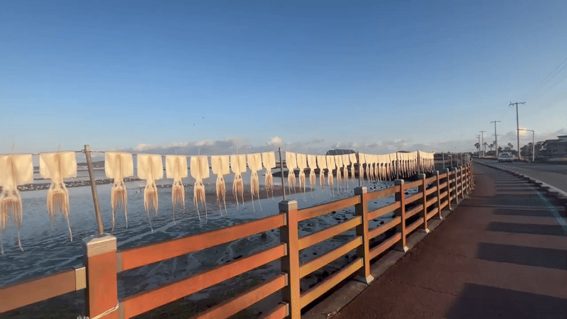 도로변에 길게 늘어서서 해풍 맞으며 건조되고 있는 오징어(준치)들을 보면 그냥 지나칠 수가 없답니다.