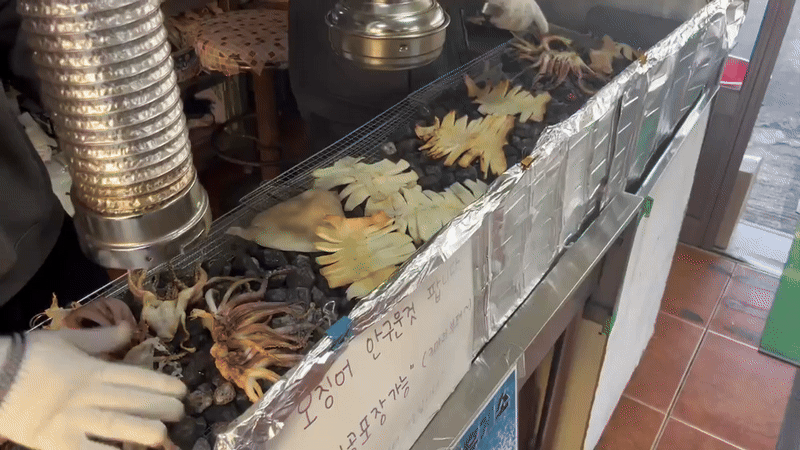 주문을 하면 사장님께서 달궈진 맥반석 위에 오징어를 꾹꾹 눌러가며 맛있게 구워주십니다.