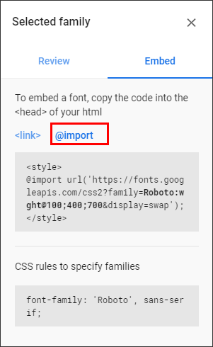 css문서에 @import규칙으로 가져옴 | <style> @import url('https://fonts.googleapis.com/css?family=Spectral+SC'); </style> |