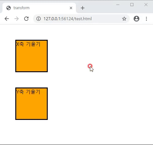 - 첫번째 오렌지 박스에 마우스 오버하면 수평적(x축)으로 기울게 처리