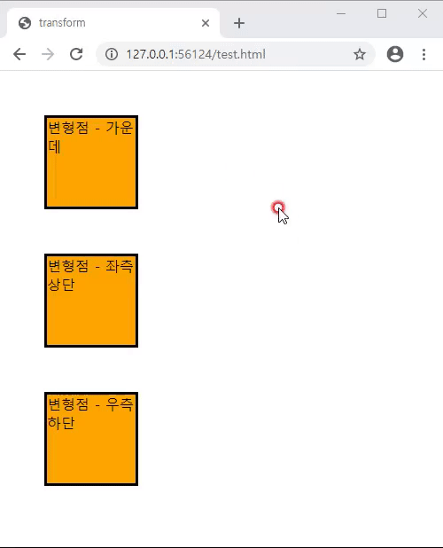 - 첫번째 오렌지 박스는 변형점이 가운데여서 가운데를 중심으로 기움
