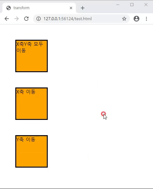 - 첫번째 오렌지 박스에 마우스를 올리면 x축과 y축이 동시에 이동