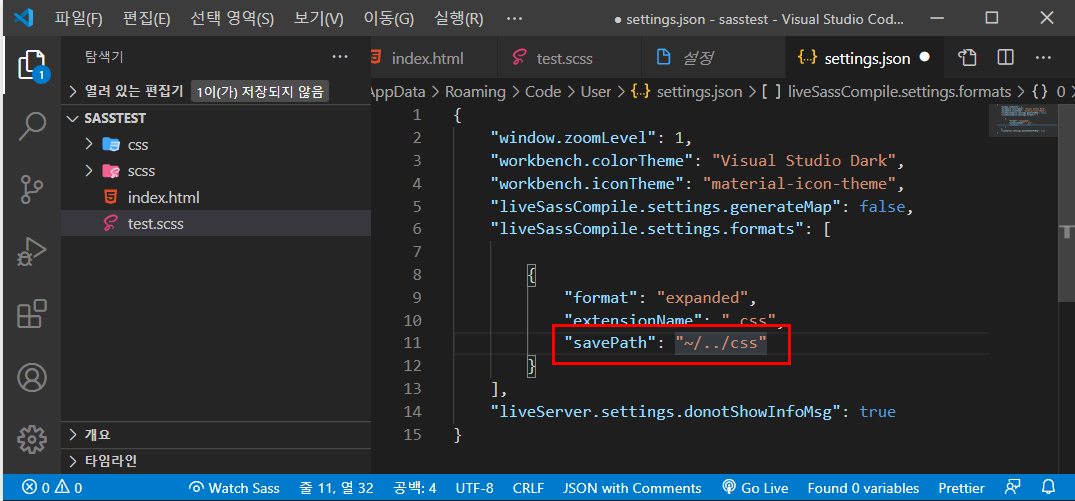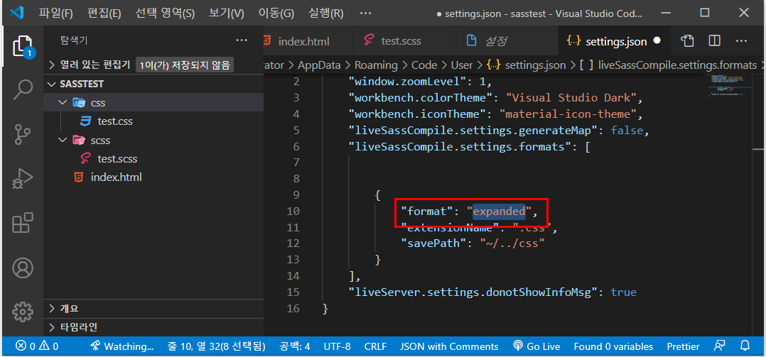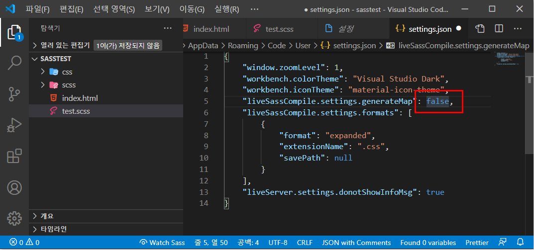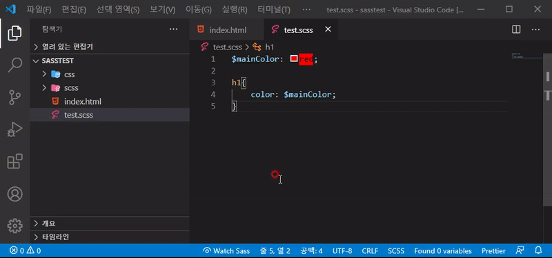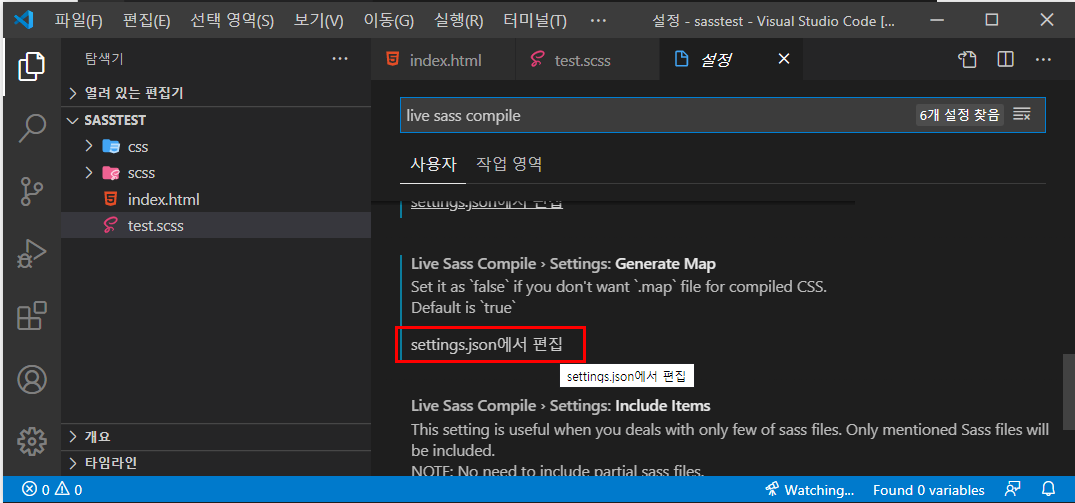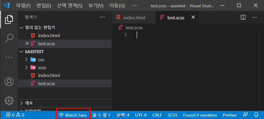- [test.css]파일은 미리 지우고 [test.scss]파일은 [scss]폴더내부로 옮기고 [Watch Sass]기능은 다시 해제