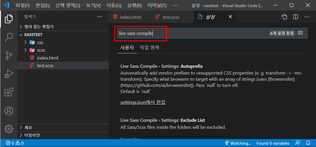 2) 설정 창에서 [Live Sass Compile]를 검색